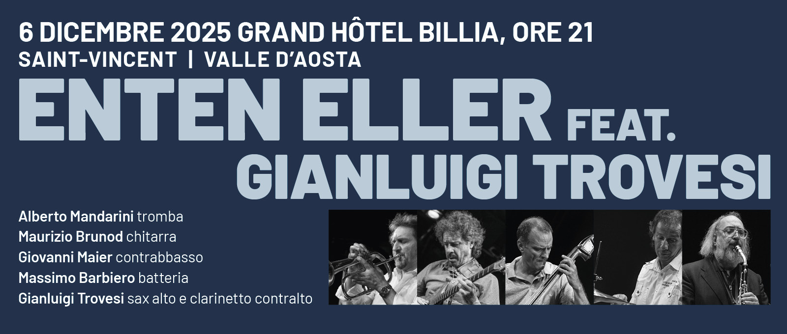 Sabato 6 dicembre alle ore 21, Sala Monte Bianco del Grand Hôtel Billia ENTEN ELLER feat. GIANLUGI TROVESI Alberto Mandarini, tromba Maurizio Brunod, chitarra Giovanni Maier, contrabbasso Massimo Barbiero, batteria Special guest: Gianluigi Trovesi, sax alto e clarinetto contrabbasso Prenota gratuitamente QUI Tra le formazioni italiane... Leggi tutto